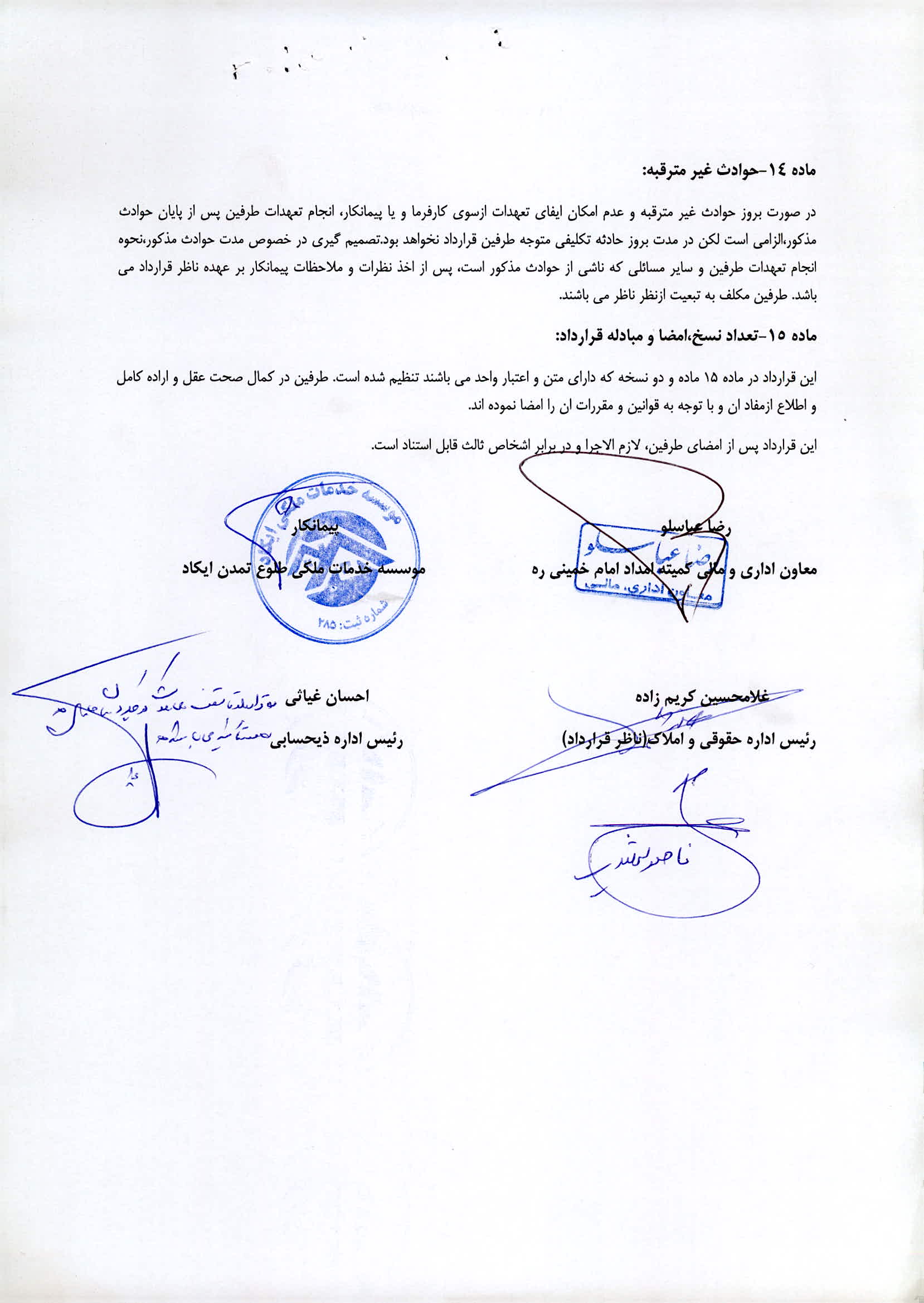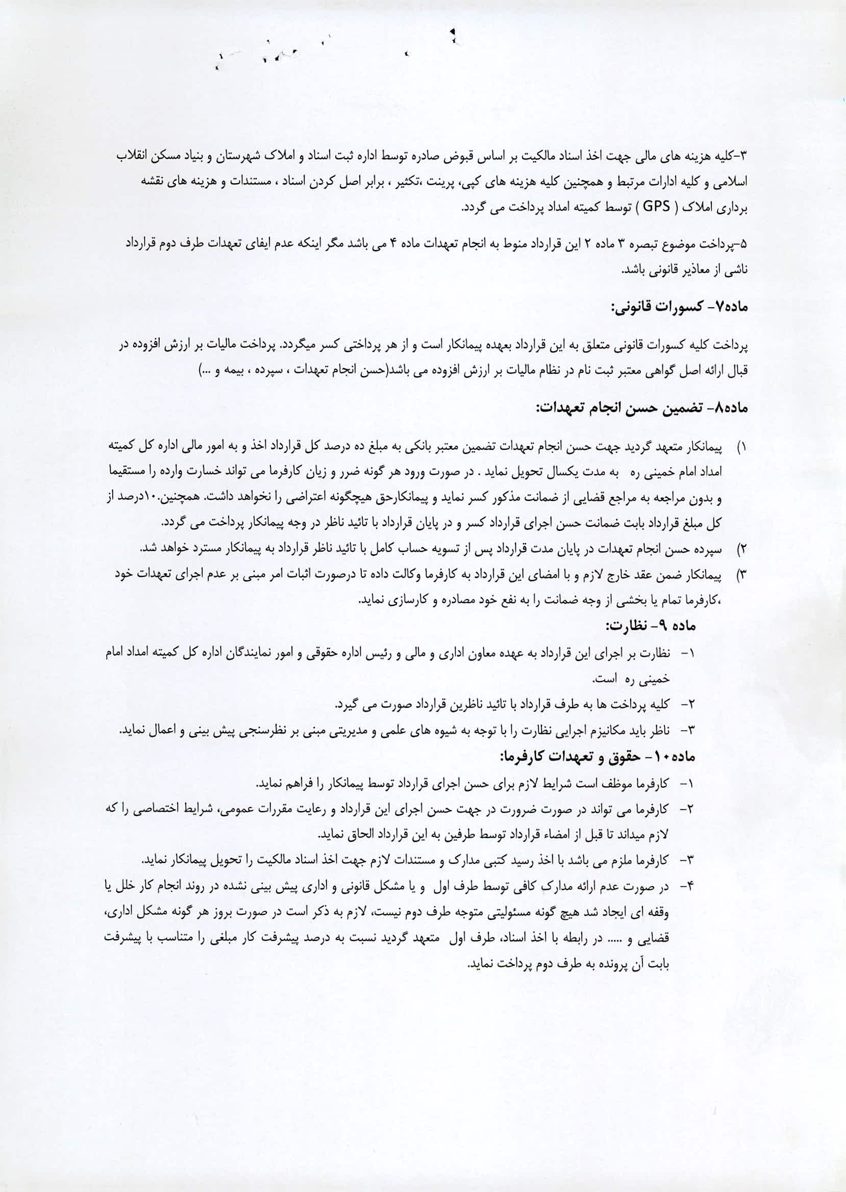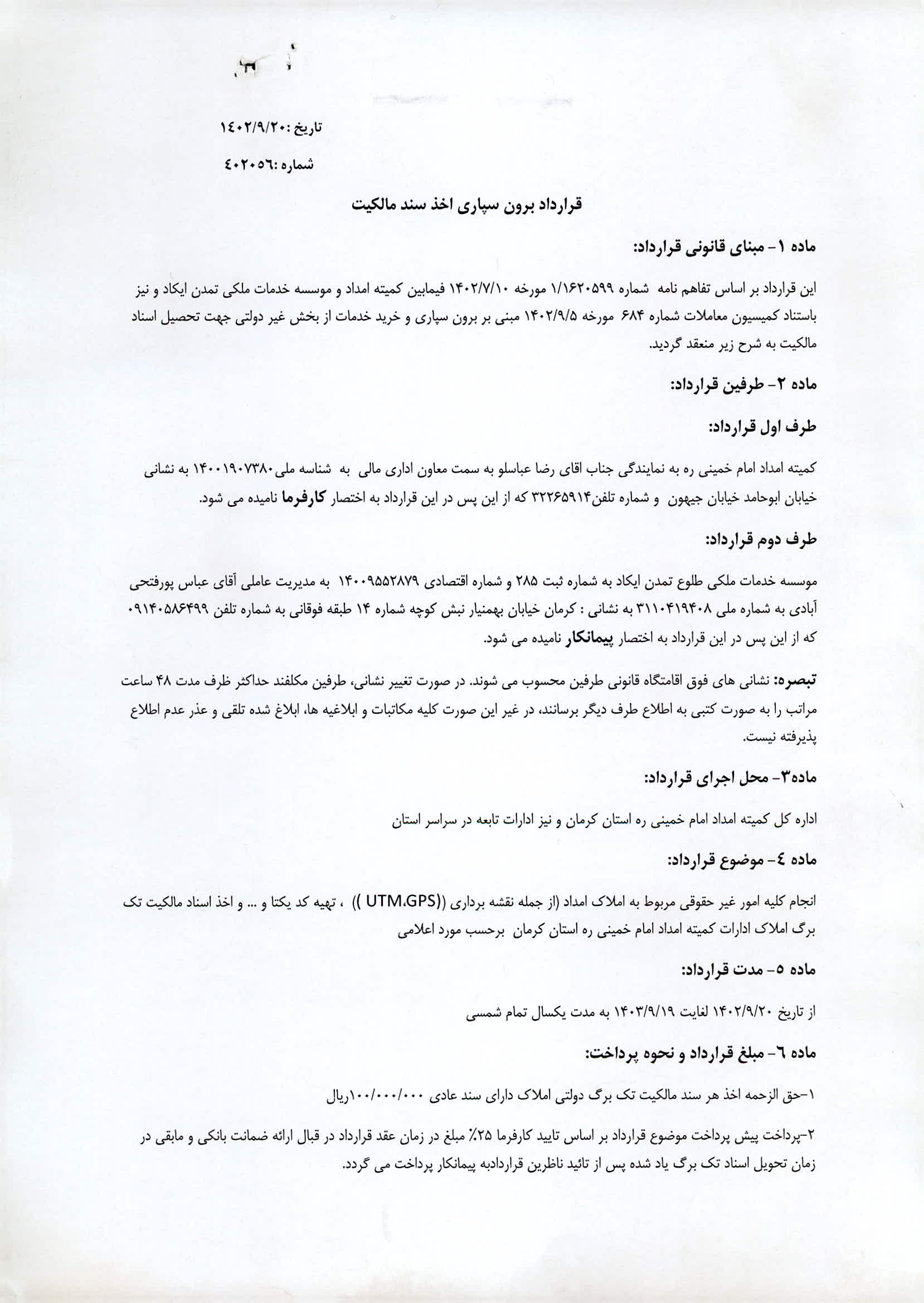 قرارداد فی ما بین کمیته امداد امداد امام خمینی ره و موسسه خدماتی تمدن ایکاد باستناد کمیسیون معاملات 684 مبنی بر برونسپاری و خرید خدمات از بخش غیر دولتی جهت تحصیل اسناد مالکیت