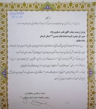 به گزارش پایگاه اطلاع رسانی کمیته امداد، سید مرتضی بختیاری، رئیس کمیته امداد با ارسال لوح تقدیر از ناصر عسکری نژاد، مدیرکل کمیته امداد استان کرمان به واسطه ارائه خدمات توانمندساز به مراجعین و متقاضیان (میز ارتباطات مردمی) در جریان سفر رئیس جمهور به استان کرمان و فعالیت های ارزشمند ایشان در جریان سازی استمرار این خدمات تقدیر و قدردانی کردند.